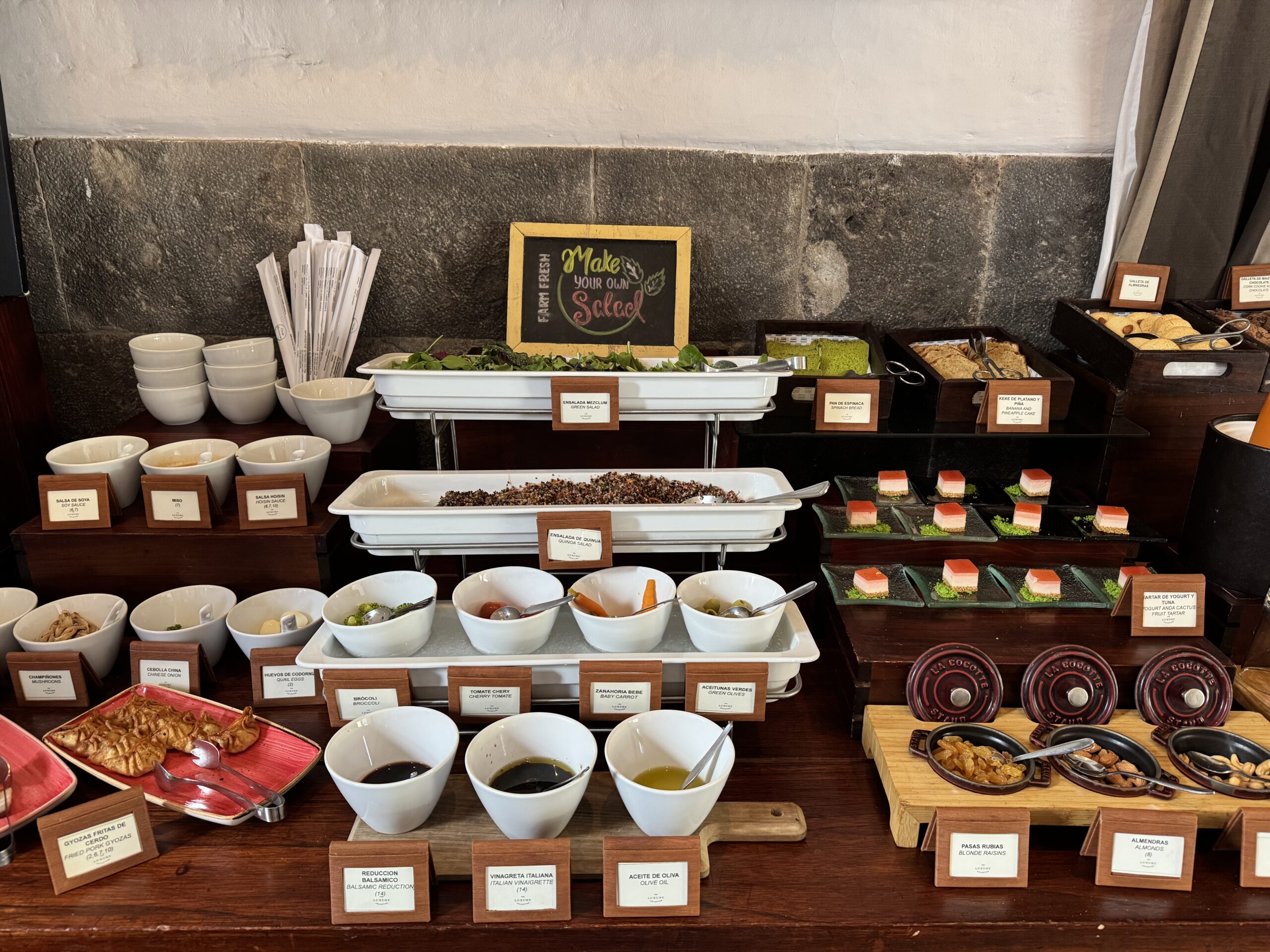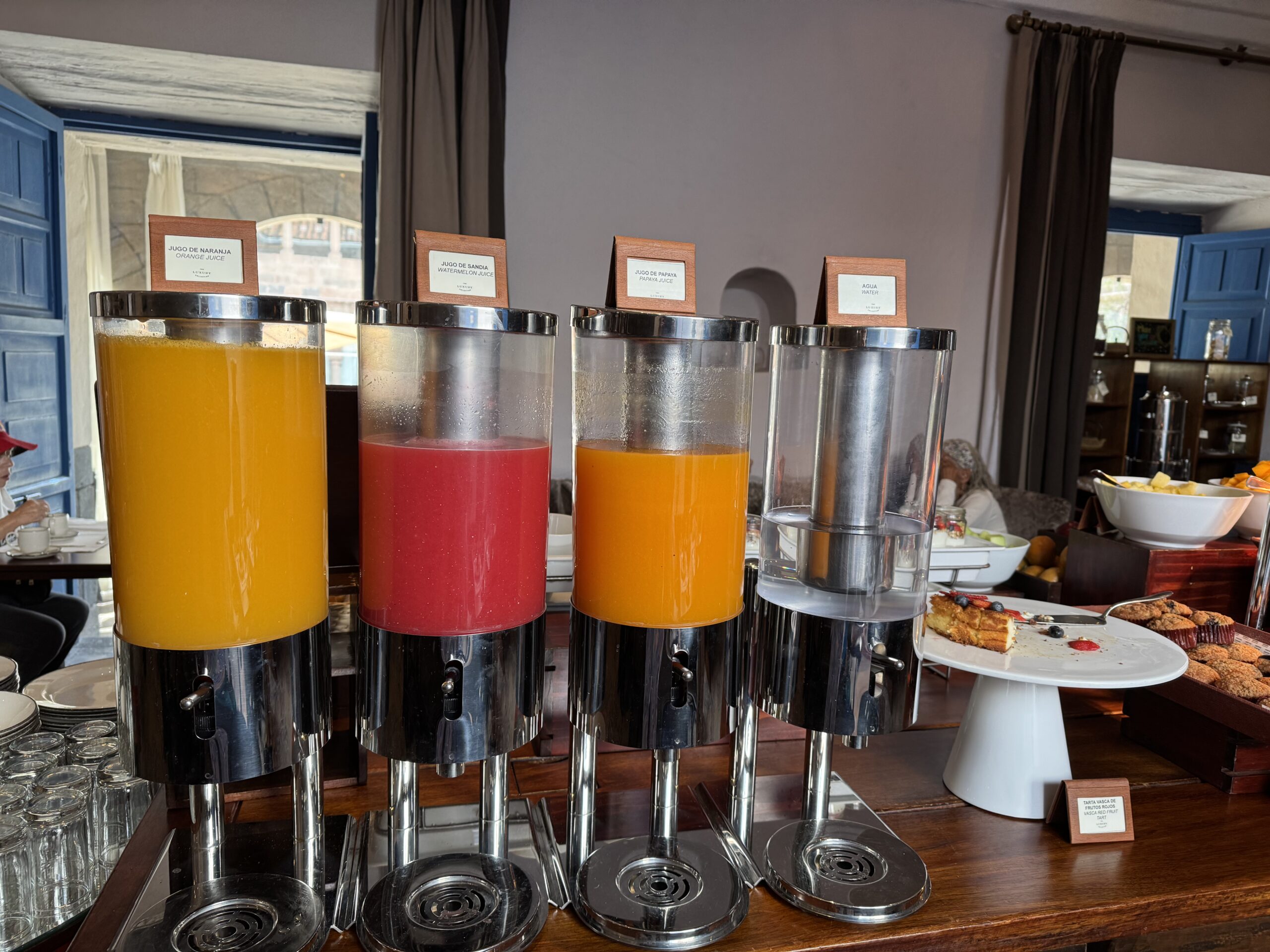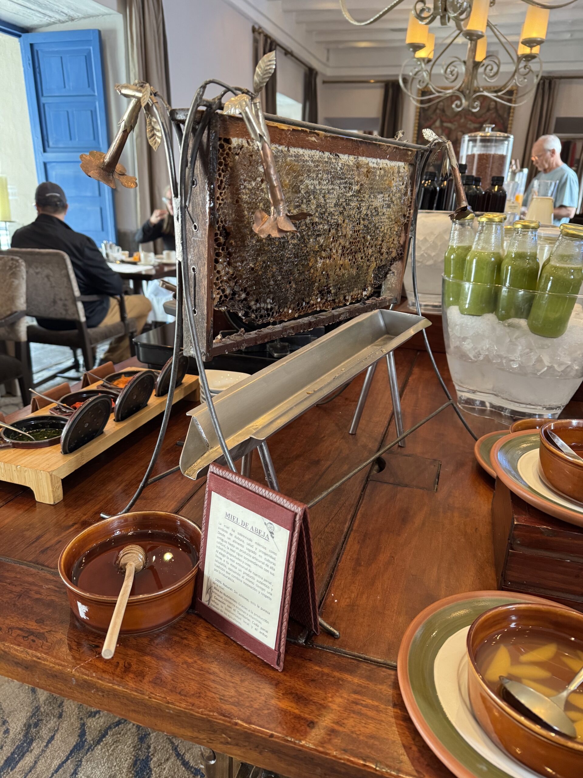 Look at this spread we had at our Marriott hotel in Cusco, Peru called Palacio Del Inka. We drank fresh beetroot juice every morning. I also grabbed a green smoothie when available, and fresh papaya or orange juice. They offered four fresh juices. And also look at the honey fresh from the honeycomb. I’d never seen this before. I was amazed at the chia seeds, nuts, greens, and variety of fruits offered at this breakfast buffet. It’s all about making wise choices.